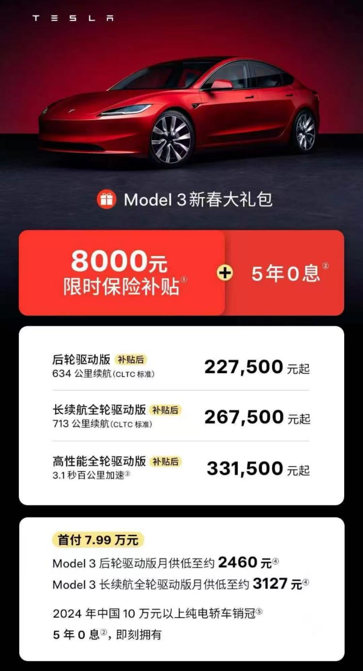 2月5日,特斯拉Model 3推出了一波前所未有的优惠组合拳。此次优惠包括限时8000元保险补贴,还搭配了5年0息政策和专属充电权益。这是特斯拉首次将保险补贴覆盖到Model 3全系车型,甚至连高性能版也不例外。